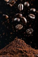 Dit prachtige kunstwerk legt het moment vast waarop koffiebonen door de lucht dwarrelen, omringd door een wolk van fijn koffiepoeder. Het donkere, contrastrijke achtergrondontwerp benadrukt perfect de textuur en details van de bonen en het poeder. Deze afbeelding is ideaal voor keukens, cafés of kantoren en voegt een dynamische, energieke sfeer toe aan elke kamer.
