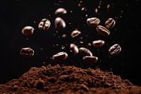 Dit fascinerende kunstwerk toont vliegende koffiebonen boven een stapel versgemalen koffie in indrukwekkend detail. De dynamische afbeelding van de bonen in beweging legt perfect het moment van koffiecreatie vast en brengt de energie en versheid van koffie bij je thuis. Deze afbeelding is ideaal voor in de keuken, het café of op kantoor en brengt de passie en het vakmanschap over dat in elk kopje koffie zit.