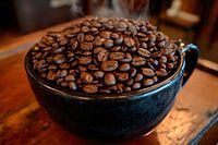 Een weelderige zee van glanzende, vers gebrande koffiebonen wordt gepresenteerd in een stijlvolle, donkere kop. Het verleidelijke aroma van koffie streelt de zintuigen en roept herinneringen op aan gezellige ochtenden. Dit beeld geeft elke keuken een uitnodigend tintje en zorgt voor een vleugje verwennerij en gezelligheid.