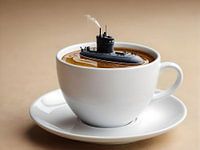 Stap in een wereld waar verbeelding en realiteit naadloos samensmelten met "Koffieduik", een surrealistisch digitaal kunstwerk dat de grenzen van het alledaagse doorbreekt. Dit unieke stuk toont een miniatuur duikboot die vredig op het oppervlak van een kop koffie drijft, een verrassende en intrigerende samenkomst van twee totaal…
