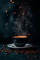 Donkere elegantie ontmoet verkwikkende frisheid: een dampende kop koffie, omringd door drijvende koffiebonen, creëert een uitnodigende sfeer. Het samenspel van diepzwarte en bruine tinten voegt een vleugje gezelligheid en stijl toe. Perfect voor de keuken of moderne woonkamer, waar plezier en inspiratie elkaar ontmoeten.