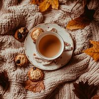 Tussen de herfstbladeren ontvouwt zich een gezellig tafereel: een dampende mok thee rust op een delicaat bord, omringd door versgebakken koekjes. De zacht gebreide deken creëert een uitnodigende sfeer en belooft gezellige uren vol plezier en warmte. Perfect om tot rust te komen en de natuur te beleven.