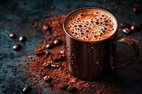 Een heerlijk gezicht om de zintuigen te prikkelen: een dampende mok koffie omringd door gemalen bonen en een vleugje vers cacaopoeder. De levendige textuur en rijke kleur creëren een uitnodigende sfeer. Ideaal voor in de keuken of het gezellige café in de woonkamer, met deze aanblik komt elke ochtend goed op gang.