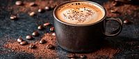 Een dampende koffie, elegant in zijn eenvoudige kopje, omringd door koffiebonen en fijn koffiepoeder, nodigt je uit om te genieten. De warme bruine tinten en uitnodigende textuur creëren een gezellige sfeer. Perfect voor de keuken, waar elk kopje aandacht voor detail en het plezier van het moment viert.