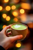 Een delicaat vleugje gezelligheid omhult het tafereel, terwijl het zachte licht op de achtergrond een warme sfeer creëert. De groene beker, elegant in de hand gehouden, straalt een uitnodigende sfeer uit, ideaal voor aan de muur in de keuken of woonkamer. Perfect om het gevoel van ontspanning en genot te benadrukken.