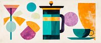 Levendige kleuren en geometrische vormen dansen harmonieus samen en geven de keuken een frisse, moderne flair. De gestileerde koffiepot in het midden nodigt uit tot gezellige ochtenden, terwijl de speelse ronde accenten de ruimte verlevendigen. Perfect voor een uitnodigende sfeer waar plezier en creativiteit samenkomen!