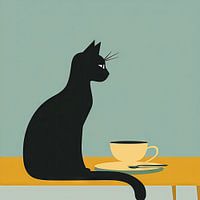 Deze charmante illustratie toont een minimalistische zwarte kat die nieuwsgierig naar een kopje koffie kijkt. Met strakke lijnen en een subtiel kleurenschema van turquoise en geel geeft deze afbeelding perfect de ontspannen sfeer van een koffiepauze weer. Dit kunstwerk is ideaal voor liefhebbers van minimalistische kunst en katten en brengt rust en stijl in je keuken of café.