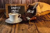 Mooie hete kop koffie met spreuk op een leistenen koffiepauze