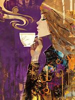 Details: vrouw, koffie, abstract, grafisch, paars, oranje, bruin, elegant, modern, kunst