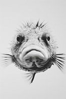 Dit zwart-wit portret van een kogelvis legt de verbazingwekkende textuur en opvallende details van dit ongewone zeedier vast. Dit kunstwerk is perfect voor liefhebbers van onderwaterfotografie en decoratieve kunst en voegt een vleugje exotisme en elegantie toe aan je kamer. De minimalistische afbeelding benadrukt de natuurlijke schoonheid en het unieke karakter van de kogelvis.
