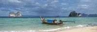 Er hangt een sfeer van eeuwigheid over deze foto, die de zachte melodie van de Andamanse Zee draagt. Een longtailboot, traditioneel en trots, rust in de smaragdgroene branding van Koh Ngai - een klein, bijna sprookjesachtig eiland in de Zuid-Thaise provincie Satun. De kleuren van de boot gloeien fel in het zonlicht, de boeg is versierd met kleurrijke doeken die als gebeden in de wind wapperen. Een visser leunt over de zijkant van de boot, verzonken in een bezigheid die net zo tijdloos lijkt als de zee zelf.