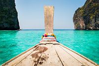 Een houten boot vaart de helder blauwe / turquoise zee op. Eiland leven van Koh Phi Phi eiland in Thailand.
