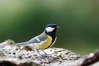Kohlmeise auf Futtersuche auf einem Baumstumpf.