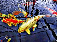 Een grote witte Koi Carp roept een vergadering bijeen met zijn kleurrijkere broers om te protesteren tegen mensen die zich verzamelen om foto's van hen te maken. Of misschien om het leven in het algemeen te bespreken? Een Koi Carp bijeenkomst.