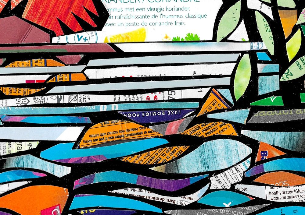 Collage van snippertjes verpakkingsmateriaal die tesamen een afbeelding vormen van een geabstraheerd landschap. De inspiratie betaat uit steen, water,vissen, bamboe en japanse esdoon. Van dichtbij of bij sterke vergroten wordt de afbeelding steeds minder duidelijk en gaan alle product en reklame teksten op de snippers hun aandacht opeisen. Ze nodigen uit tot een zoektocht naar herkenbaarheid