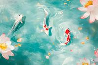 Levendige koivissen in oogverblindende kleuren ontvouwen zich te midden van zachte golven en stralende waterlelies. Hun harmonieuze samenspel op het oppervlak straalt rust en elegantie uit. Dit artistieke motief brengt een vredige sfeer in de woonkamer en nodigt uit om te blijven hangen en te dromen. Ideaal voor iedereen die de schoonheid van de natuur in zijn kamer wil brengen.