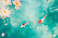 Delicaat vijverlandschap in zachte aquatinten, afgewisseld met zwemmende karpers en glinsterende waterlelies. Deze harmonieuze compositie brengt rust en zen in elke kamer. Perfect voor een slaapkamer of woonkamer, het creëert een ontspannen sfeer en nodigt uit tot dagdromen, terwijl de levendige kleuren een frisse wind laten waaien.