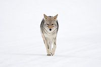 Coyote / Kojote ( Canis latrans ) in winter, walking directly towards the photographer, holding eye contact, frontal shot, Yellowstone NP, Wyoming, USA.