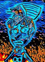 Een tekening van een verbaasde kok waarbij een muis onder zijn koksmuts vandaag komt , en deze bewerkt tot graffiti.