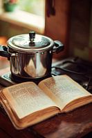 Hier is een harmonieuze combinatie van traditie en creativiteit zichtbaar: de glanzende kookpot weerspiegelt het licht, terwijl het opengeslagen boek verhalen en recepten bevat. Dit tafereel straalt gezelligheid uit en is perfect voor de keuken, waar koken en lezen samensmelten tot een inspirerende ervaring.