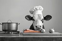 Een charmant dier dat een meester-kok is in de keuken! Met een sneeuwwitte koksmuts en een gemotiveerde blik staat de koe klaar om een heerlijk gerecht uit verse groenten te toveren. Dit humoristische kunstwerk brengt leven en een vleugje plezier in elke moderne keuken. Perfect voor creatieve voedselliefhebbers!