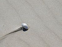 Close-up van een kokkel (Cardiidae) die is aangespoeld op het Noordzeestrand. Je kunt nog steeds de sporen in het zand zien die zijn achtergelaten toen de mossel door het water werd verplaatst.