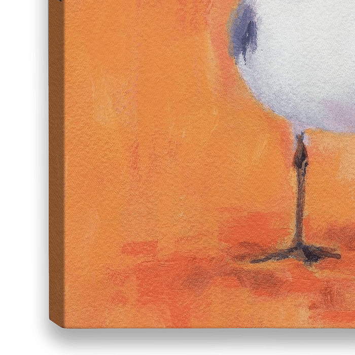 Tegen een abstracte achtergrond in verschillende tinten oranje, zand en geel staat een kleine black-headed meeuw die de kijker nieuwsgierig aankijkt.