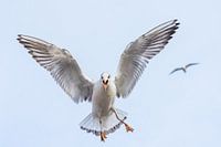 Kokmeeuwen bij De Rijnkade in de stad Arnhem. Als je daar op de kade gaat zitten vliegen ze je geregeld om de oren.