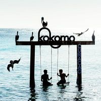 Op het strand van Kokomo Beach/Vaersen baai tref je deze bijzondere schommel aan. Pelikanen zijn de vogel die je ziet in deze foto.