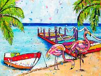 Kleurrijk schilderij van het strand Kokomo in Curaçao met 2 flamingo's en een vissersbootje.