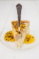 kokos-flensjestaart met passievruchtensiroop. Op een wit steigerhouten ondergrond.