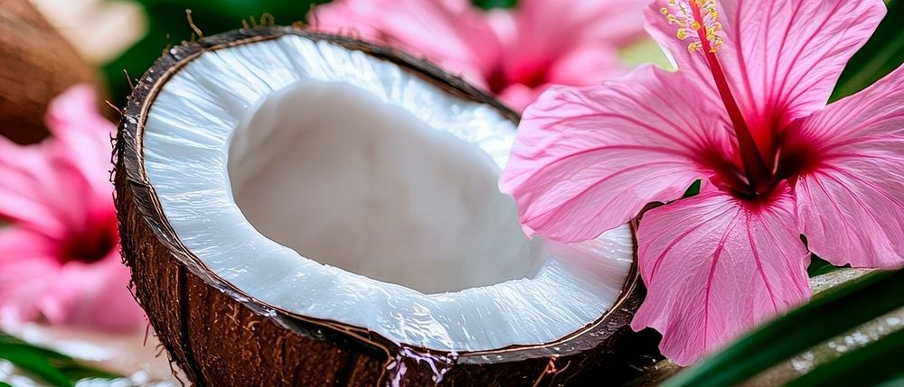 Tropische elegantie ontvouwt zich in deze harmonieuze compositie, waarin de sappige kokosnoot wordt omlijst door heldere hibiscusbloesems. De frisse groene tinten van de bladeren creëren een uitnodigende sfeer. Deze foto is ideaal voor de keuken of woonkamer en brengt het gevoel van vakantie en ontspanning bij je thuis.
