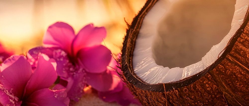 Met een gehalveerde kokosnoot omringd door delicate, paarsgekleurde bloemen straalt dit tafereel tropische flair en ontspanning uit. Het zachte licht en de achtergrond van goudkleurig zand geven de kamer een warme, uitnodigende sfeer. Perfect voor de woonkamer om een vakantiestemming en een extra dosis exotisme te integreren.