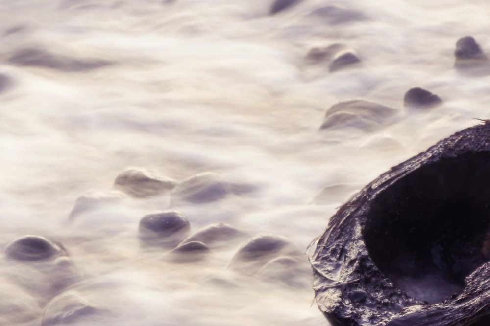 De schil van een kokosnoot wiegt in de branding van het Filippijnse eiland Leyte. Door de wat langere sluitertijd ontstaat een dynamisch, deels abstract beeld.
