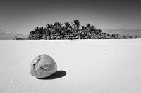 Een kokosnoot in het zand op het onbewoonde "Honeymoon Island" in de lagune van Aitutaki, Cookeilanden.