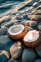 Zachte golven weerkaatsen het licht en spelen rond halve kokosnoten die rusten op gladde stenen in een rustige omgeving. Deze tropische flair geeft elke kamer een ontspannen sfeer en is bijzonder geschikt voor de keuken of woonkamer om een vakantiestemming en een gevoel van lichtheid te creëren.