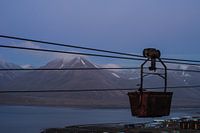 een van de voormalige "gondels" op de achtergrond Hiortfjellet