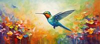 Details: kolibrie, bloemen, abstract, expressief, impressionisme, textuur, dynamisch, warm, herfsttinten, blauw, Pop of Colour