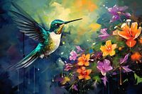 Kolibrie | Geel - Dit levendige kunstwerk toont een kolibrie in volle vlucht, omringd door een florale explosie van kleuren. De stijl is een dynamische mix van impressionisme en expressionisme waarbij de penseelstreken zowel de textuur als de beweging van de vogel en de bloemen benadrukken. Deze kleurrijke compositie bruist van energie en brengt een gevoel van joie de vivre.