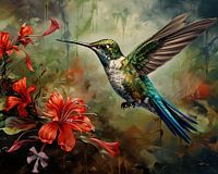 Kolibrie | Groen - Op het canvas zie je een sierlijke kolibrie in vlucht, elegant nectar verzamelend bij flamboyante rode bloemen. De groen- en blauwtinten van de vogel steken af tegen een zacht kleurenpalet op de achtergrond met hints van subtiel groen en bruin, waardoor de focus op de vogel extra benadrukt wordt. De dynamiek en detail…