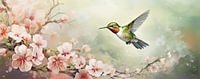 Kolibrie | Roze - Dit tafereel toont een dartelende kolibrie in volle vlucht tussen zachte, bloeiende takken, vermoedelijk kersenbloesems, met een vage, dromerige achtergrond die een serene ambiance creëert. De gebruikte stijl is een mix van realistisch en impressionistisch, waarbij de kolibrie scherp en gedetailleerd is weergegeven…