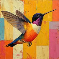 Kolibrie Vleugel | Kleurrijke Kolibrie - Op dit vogels schilderij zie je een kleurrijke kolibrie met zijn vleugels wijd open, tegen een opvallende, abstracte achtergrond in felle tinten zoals geel en oranje.
