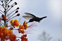 Tegenlichtopname van een kolibrie bij een tuterutu. De foto is gemaakt op Bonaire. De tuterutu of pauwenbloem is een tot 3 m hoge struik of zelden een tot 6 m hoge boom met een losse kroon. De twijgen dragen spaarzaam doornen. De afwisselend geplaatste, tot 30 cm lange bladeren zijn dubbelgeveerd. Ze dragen drie tot negen paar…