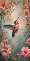 Tussen zachtroze bloemen fladdert een kolibrie, druk bezig met het verzamelen van nectar. De delicate bloesems vormen een dromerige achtergrond en de kolibrie lijkt even gewichtloos, een moment van pure schoonheid en gratie in de natuur. Het licht speelt door de bladeren, waardoor er een sfeer van magie en verwondering ontstaat.