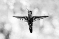 Deze indrukwekkende zwart-wit opname toont een kolibrie in volle vlucht, sierlijk zwevend tegen een zachte, bokeh-achtergrond. De uitgespreide vleugels en scherpe details van het verenkleed vormen een krachtig contrast met de wazige lichtvlekken erachter. Zonder kleur komt de vorm en beweging volledig tot zijn recht, wat het beeld een tijdloze, bijna grafische schoonheid geeft. Een kunstzinnige ode aan de elegantie van het moment.