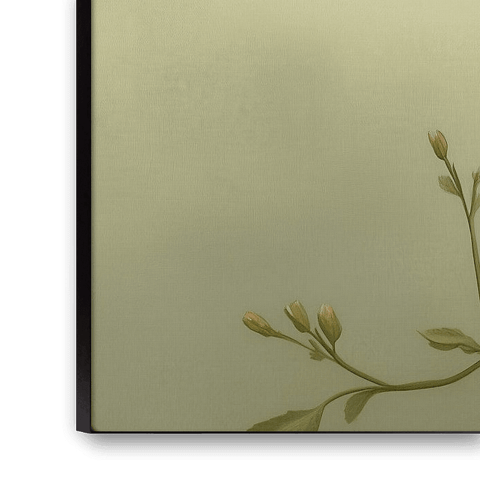 Een sierlijke kolibrie poseert tegen een zachte taupe-groene achtergrond. Op haar kop draagt ze een subtiele bloemenkrans, alsof ze net uit een sprookje is gevlogen.