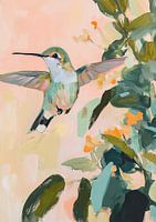 Een olieverfschilderij van een kolibrie, minimalistisch met pastelkleuren, groene planten en bloemen op de achtergrond, een roze lucht en lentestemming. Het schilderij toont zichtbare penseelstreken en heeft een abstracte, neutrale stijl.