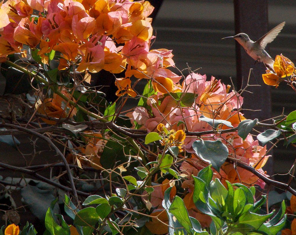 De kolibrie bekijkt welk bloemetje de lekkerste smaak heeft.