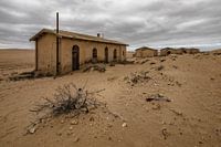 Het woestijnlandschap aan het uiteinde van de spookstad Kolmanskop. Het beroemde dorp ligt vlakbij Lüderitz en in het zogenaamde Sperrgebiet, een uitgestrekt gebied dat vanwege de diamant-mijnen niet betreden mag worden. Kolmanskop is sinds 1958 verlaten en wordt langzaam overgenomen door het woestijnzand.