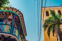 Deze foto toont de kleurrijke koloniale architectuur in de oude binnenstad van Cartagena. Een balkon met kleurrijke houten leuningen in blauw, groen, roze en geel contrasteert met een felgeel gebouw met witte details. Daartussen verheft zich een palmboom in de felblauwe lucht, terwijl hoogspanningskabels de stedelijke realiteit benadrukken.